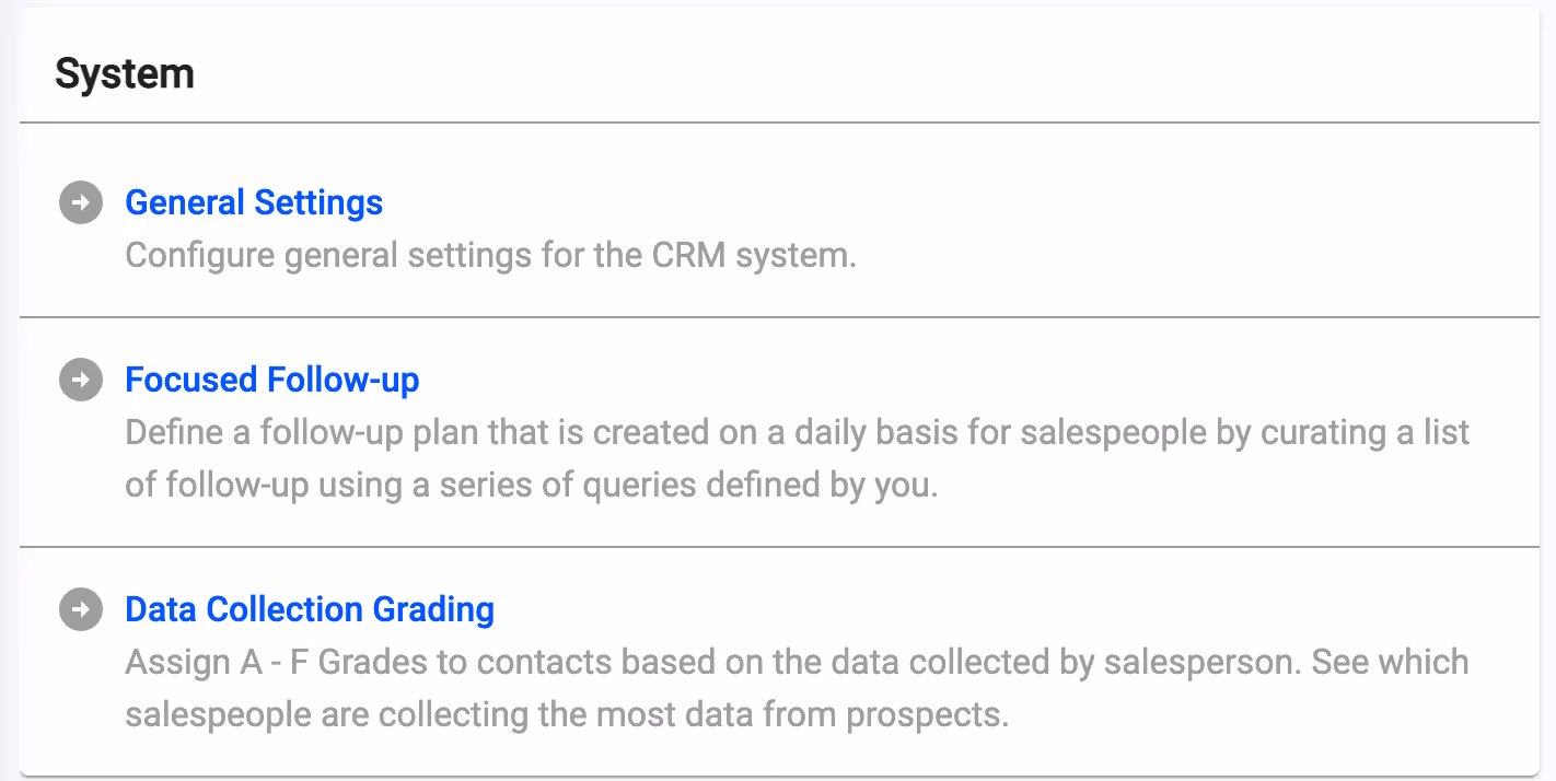 System Settings are where admins can configure key settings in UpCRM to ensure the system is a perfect fit for the dealership. Available items here are General Settings, Focused Follow-Up, and Data Collection Grading.